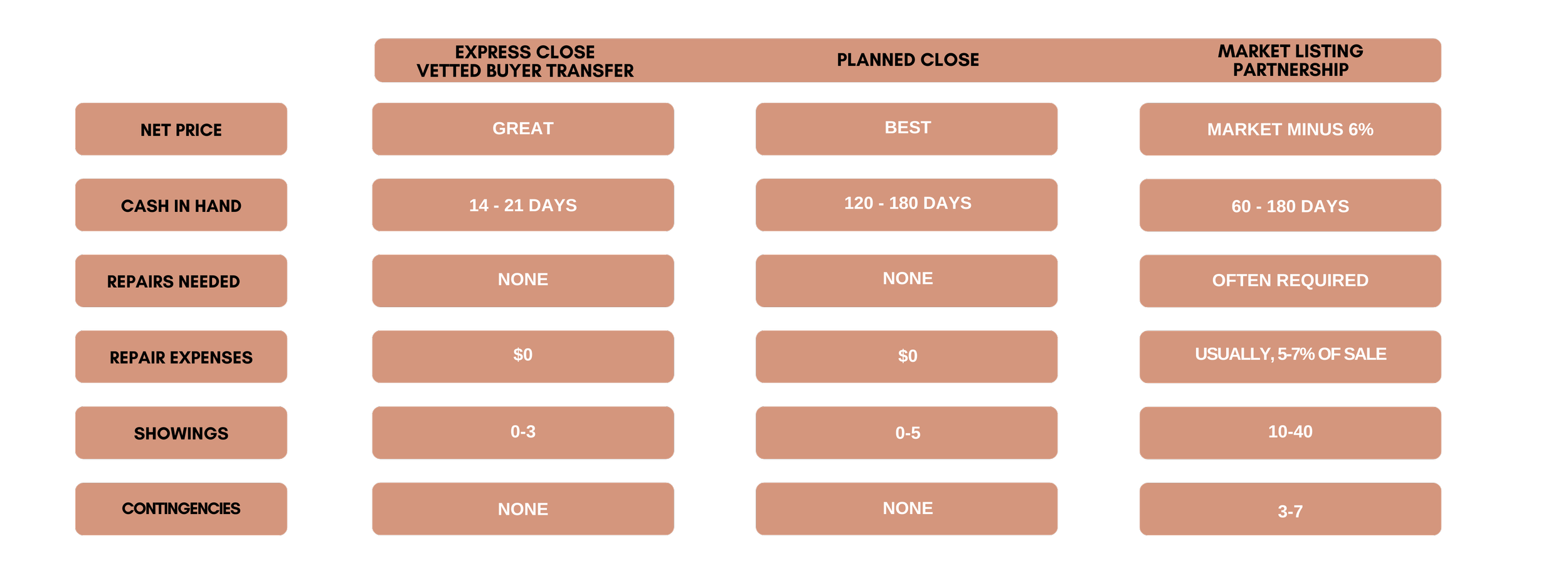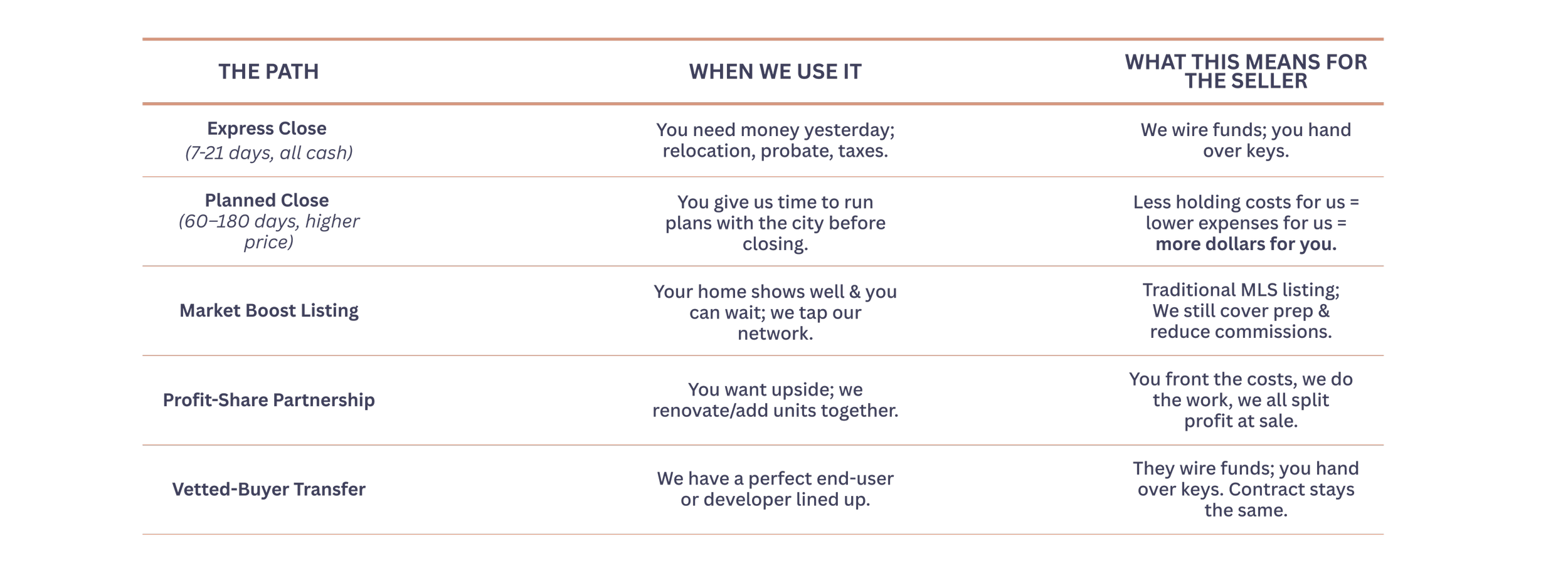 We present the best structure for your goals depending on needs, speed, maximum price, or partnership upside. Your net never changes once we’ve agreed.